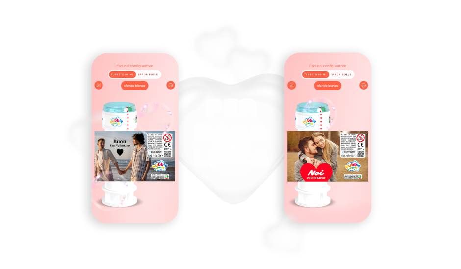 La bolla di sapone Love è unica nel suo genere: il soffiatore di questa particolare bolla di sapone è rosso a forma di cuore, l’etichetta a tema San Valentino con tanti modelli tra cui scegliere disponibili direttamente sul configuratore del sito. Se invece preferisci qualcosa di ancora più personale, nessun problema: puoi personalizzare l’etichetta da zero per creare un regalo davvero unico.