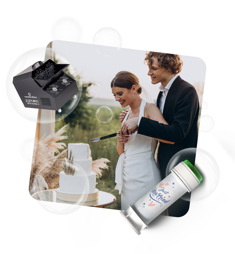 Bubble World ti offre la possibilità di rendere ogni dettaglio su misura: dalla personalizzazione delle bolle di sapone fino al noleggio della macchina o del cannone sparabolle.